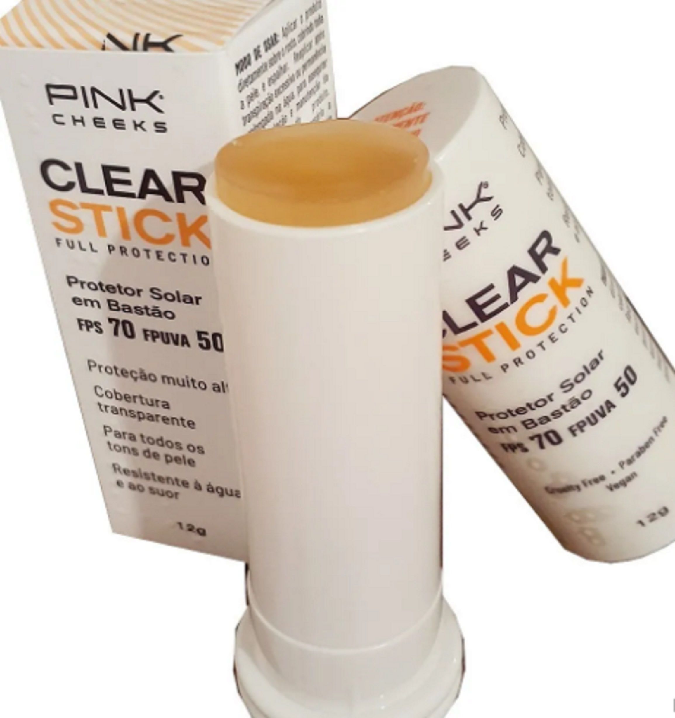 Protetor Solar transparente FPS70 FPUVA50 Clear Stick 12g O Clear Stick Full Protection é um protetor solar em bastão com altíssima proteção solar, FPS 70 e FPUVA 50. Sua cobertura é completamente transparente e não deixa nenhum resíduo branco quando aplicado na pele, é ideal para qualquer tom de pele, garantindo acabamento invisível. Rico em Vitamina E, potente ação antioxidante e antiinflamatória, protege contra os radicais livres prevenindo sinais de envelhecimento precoce e melhorando a maciez e elasticidade da pele. Bloqueia os raios UV, impedindo queimaduras, manchas e envelhecimento precoce causado pela exposição solar. Protege contra a poluição urbana, é hipoalergênico e dermatologicamente testado, o que garante a segurança do uso, sem riscos de alergias ou irritações. Indicado para todos os tipos de peles. Seu formato em bastão contribui para uma maior praticidade na aplicação, evita desperdício de produto e facilita o transporte para reaplicação. De uso diário e indicado para prática de atividades físicas, pois oferece muita resistência à água e ao suor. Rápida absorção, acabamento natural e toque seco, deixando a pele protegida, hidratada e sequinha. Sua fórmula apresenta uma associação de filtros químicos fotoestáveis que protege a pele por tempo prolongado sem se degradar. DADOS TÉCNICOS Altíssima proteção FPS 70 FPUVA 50 Toque seco, não oleoso Acabamento invisível Ideal para a prática esportiva Resistente à água e ao suor por até 4h Vegano e Livre de Parabenos Não testado em animais Dermatologicamente testado MODO DE USAR Aplique o protetor solar de maneira abundante por toda extensão do rosto, incluindo a região dos olhos. Após a aplicação, espalhe o produto. Rápida absorção acabamento natural e toque seco. É necessária a reaplicação do produto após a transpiração excessiva ou permanência prolongada na água, para manter a sua efetividade. Se a quantidade aplicada não for adequada, o nível de proteção será significativamente reduzido. Ajuda a prevenir as queimaduras solares. COMPOSIÇÃO DODECANE; ISOAMYL P-METHOXYCINNAMATE; DIETHYLAMINO HYDROXYBENZOYL HEXYL BENZOATE; C 12-15 ALKYL BENZOATE; BIS ETHYLHEXYLOXYPHENOL METHOXYPHENYL TRIAZINE; ETHYLHEXYL TRIAZONE; OCTOCRILENE; BUTYL METHOXYDIBENZOYLMETHANE; EHYLHEXYL SALICYLATE; DIBUTYL LAUROYL GLUTAMIDE; CYCLOPENTASILOXANE / ACRYLATES/DIMETHICONE COPOLYMER; METHYL METHACRYLATE CROSSPOLYMER; DIBUTYL ETHYLHEXANOYL GLUTAMIDE; POLYSILICONE-15; SILICA SILYLATE; PHENOXYETHANOL; PARFUM; TOCOPHERYL ACETATE; BRASSICA CAMPESTRIS/ALEURITES FORDI OIL COPOLYMER; PENTHAERYTHRITYL TETRA-DI-T-BUTYL HYDROXYHYDROCINNAMATE; D-LIMONENE; HEXYL CINNAMAL; LINALOOL; GERANIOL; ALPHA ISOMETHYL IONONE. ANVISA: 25351.056146/2020-11 A Pink Cheeks não realiza testes de seus produtos em animais. Nossos testes são realizados em pessoas voluntárias, através de laboratórios credenciados. A ANVISA considera hipoalergênico os produtos que passaram por testes de sensibilização realizados em humanos em laboratórios especializados. Hipoalergênicos são produtos com menos chance de causar alergia. No entanto, não há garantias de que o produto não causará alergia em 100% das pessoas, já que cada pessoa tem uma reação diferente. A PINK CHEEKS não classifica este produto como hipoalergênico, uma vez que o produto não passou por testes. Você pode ter acesso à composição de todos os produtos da PINK CHEEKS através da página de cada produto em nosso site.